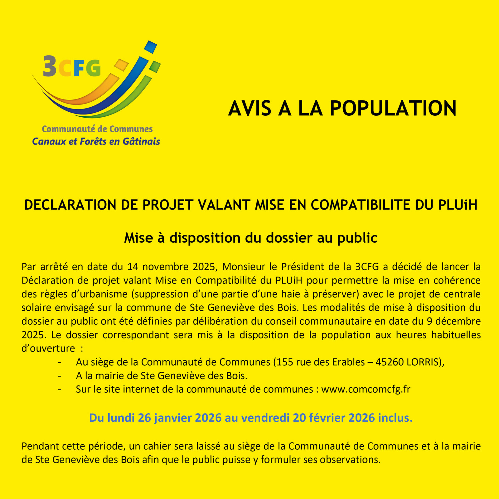 Avis à la population - Dossier de mise en compatibilité du PLUi-H