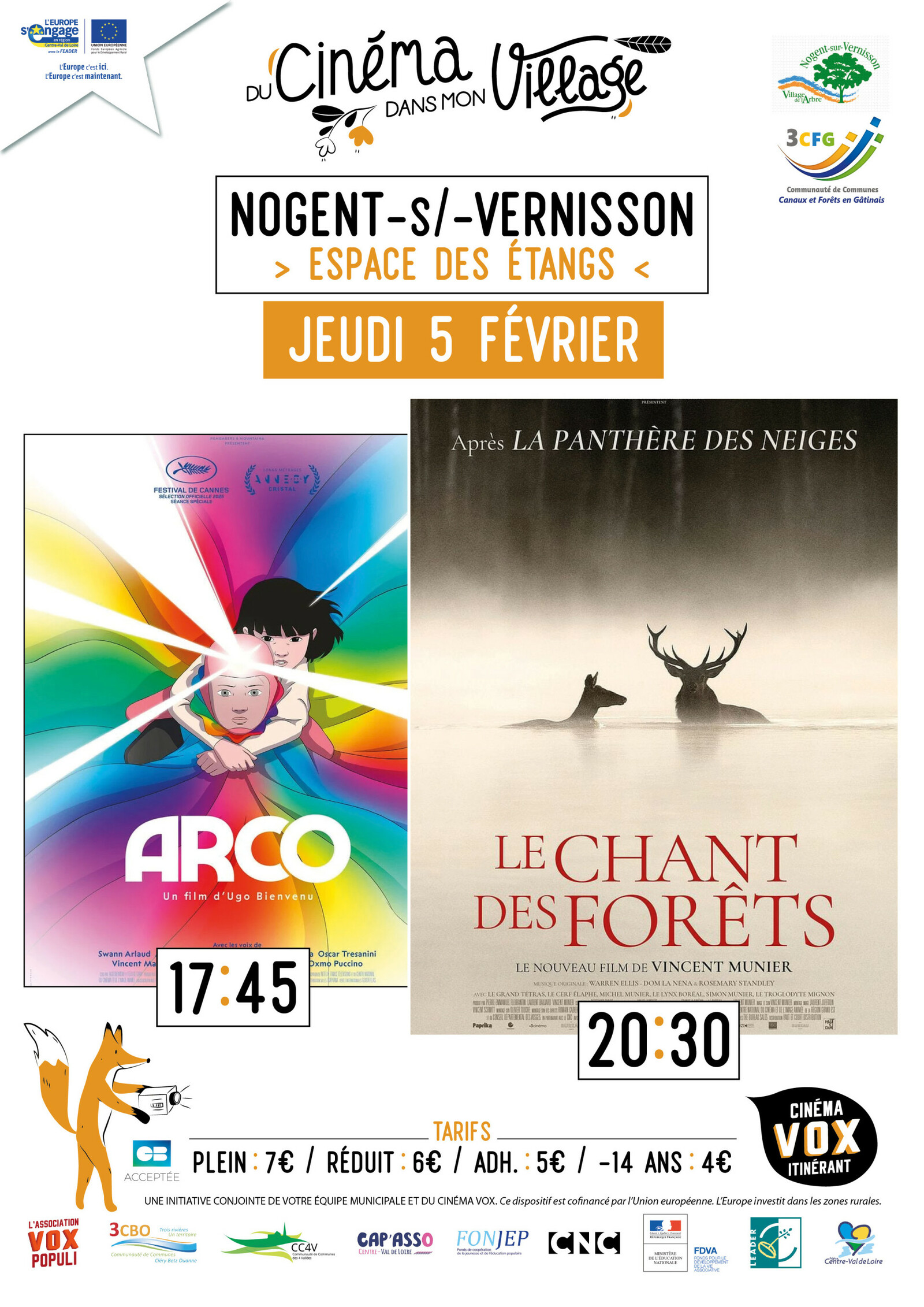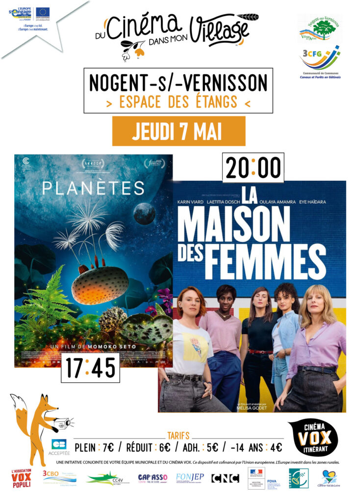 Comment faire pour que le cinéma existe dans nos villages ? L’association Vox Populi de Château-Renard répond à cet enjeu en proposant un réseau cinématographique itinérant, auquel Nogent sur Vernisson s'est associé. Ainsi, chaque premier jeudi du mois, vous pouvez retrouver 2 films à l’affiche dans la salle de l’Espace des Étangs (rue de Bellevue), prêtée pour cette occasion par la Communauté de Communes Canaux et Forêts en Gâtinais :